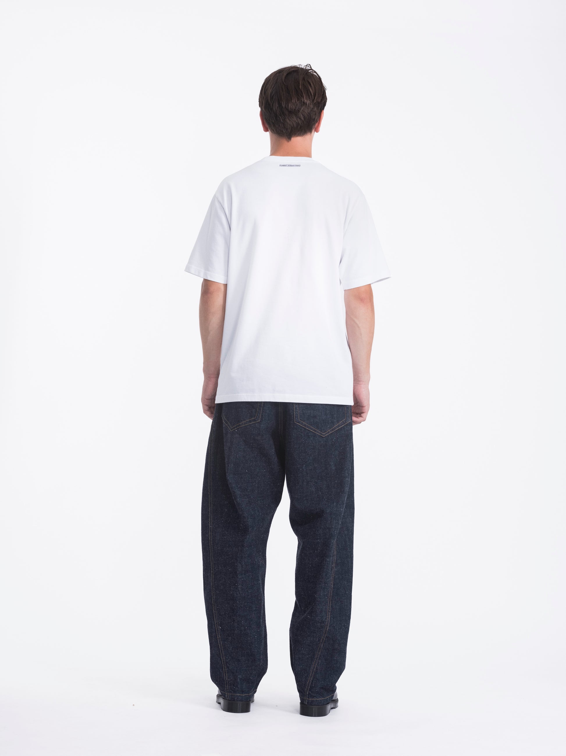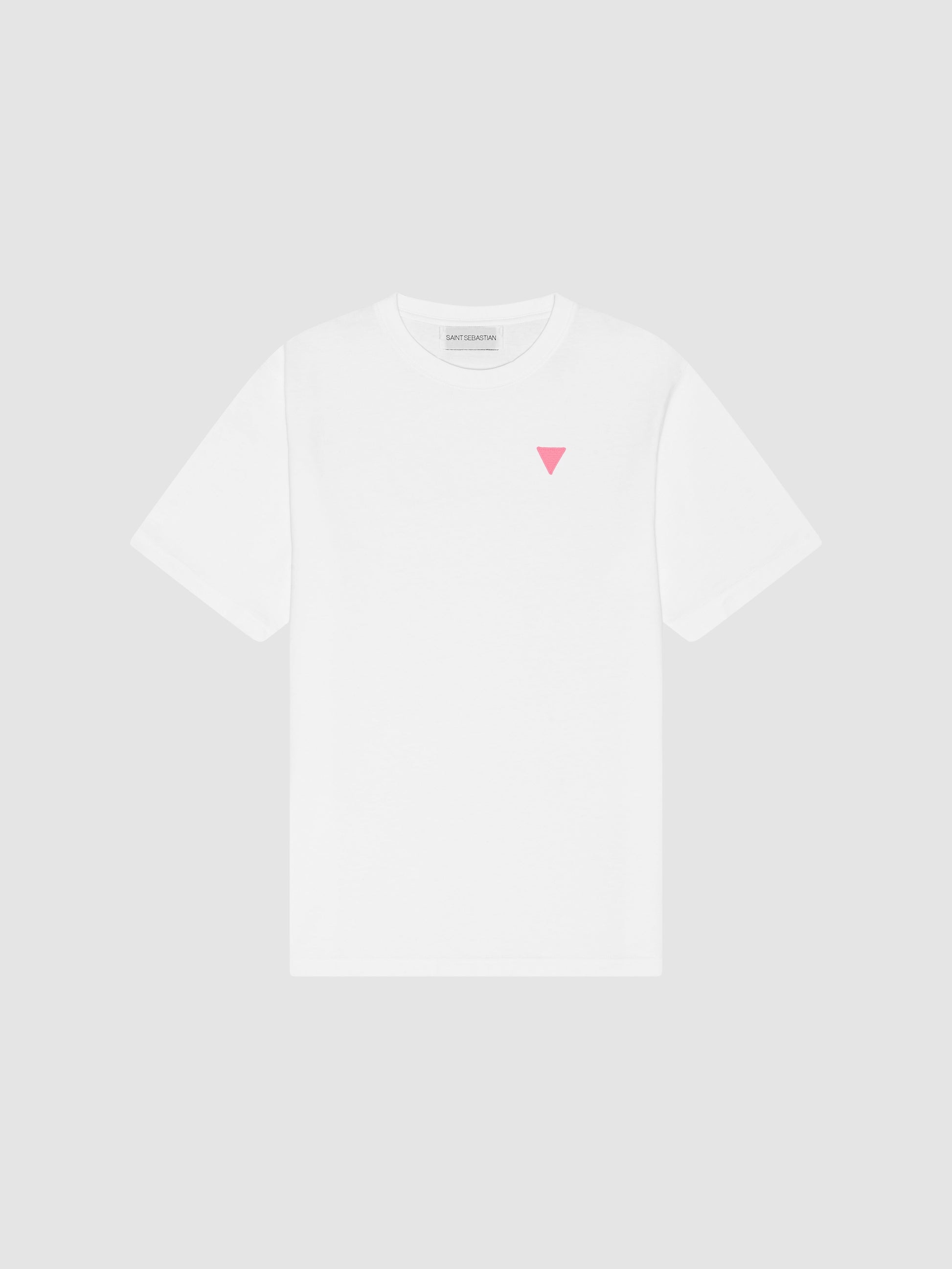Classic white t-shirt with embroidered pink triangle emblem on the front.